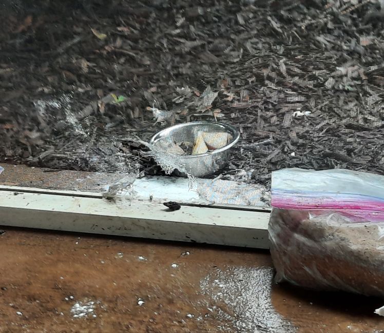 After trying to catch him in a plastic cloth shopping bag, feed him something in case he was hungry, and even try to direct him to wide open spot in the screen, I placed a small bowl with more apple in it outside the screen hole, to hopefully lure him outside again! But that didn’t work. So I gave up and went inside to see if he would calm down.
